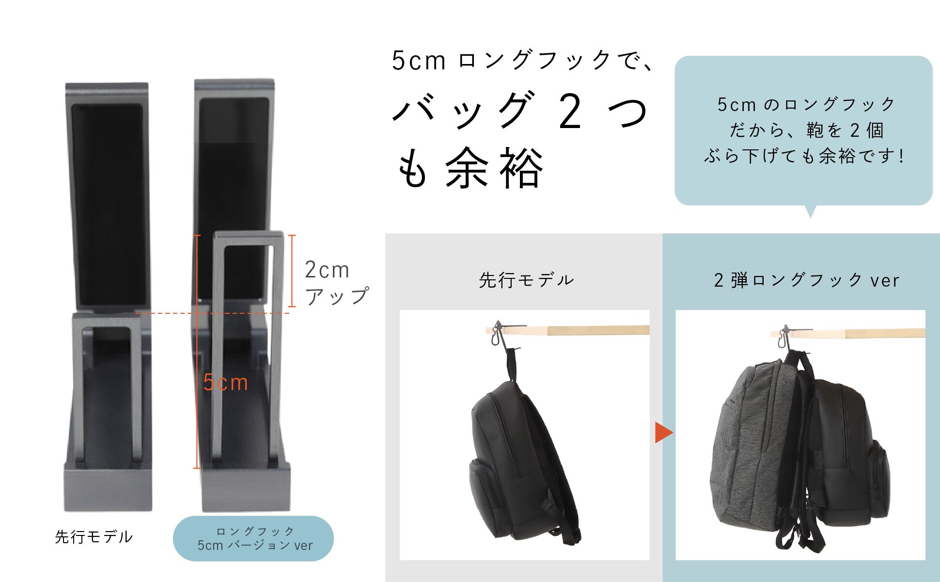 ✅ロングフック設計(長さ5.2cm)▶︎「奥行きにゆとりがあり、複数のバッグを同時に掛けられます。